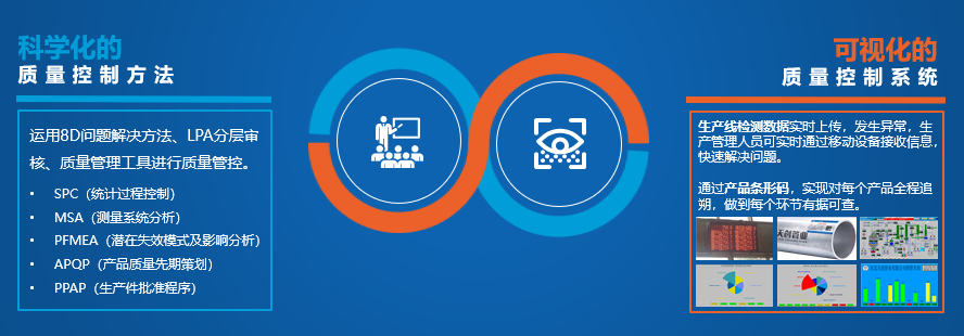 近年來,天創(chuàng)管業(yè)制定了具有自身特色的質(zhì)量標(biāo)準(zhǔn)控制體系,做到定人、定責(zé)、定目標(biāo)、全流程監(jiān)控。通過產(chǎn)品條形碼100%掃描,實現(xiàn)對每個產(chǎn)品全程追朔,做到每個環(huán)節(jié)有據(jù)可查;通過對生產(chǎn)線檢測數(shù)據(jù)同步上傳,一旦發(fā)生異常,生產(chǎn)管理人員即刻通過數(shù)據(jù)大屏實時監(jiān)測到預(yù)警信息,快速解決問題;通過信息管理系統(tǒng),實現(xiàn)各項流程參數(shù)可視化動態(tài)監(jiān)測,更具智能化。在質(zhì)量管控上,公司運用8D問題解決方法、MSA分析 、FMEA管控、LPA分層審核及相關(guān)管理工具等實現(xiàn)有效質(zhì)量管控,大幅提升了質(zhì)量標(biāo)準(zhǔn)控制水平,使產(chǎn)品問題發(fā)生率以50%速度逐年降低。公司標(biāo)準(zhǔn)體系框架、標(biāo)準(zhǔn)管控工具、標(biāo)準(zhǔn)化信息服務(wù)平臺成為支撐新體系建設(shè)的關(guān)鍵載體,為推進(jìn)產(chǎn)品質(zhì)量標(biāo)準(zhǔn)提供了 “天創(chuàng)模式”。推進(jìn)精益管理,