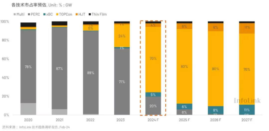 從“n型”技術(shù)路線市占率來看,2024年TOPCon已拿下70%左右的市場份額,按照InfoLink Consulting預(yù)測,到2025年TOPCon市占率將提升至80%。